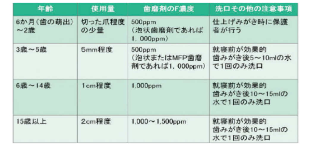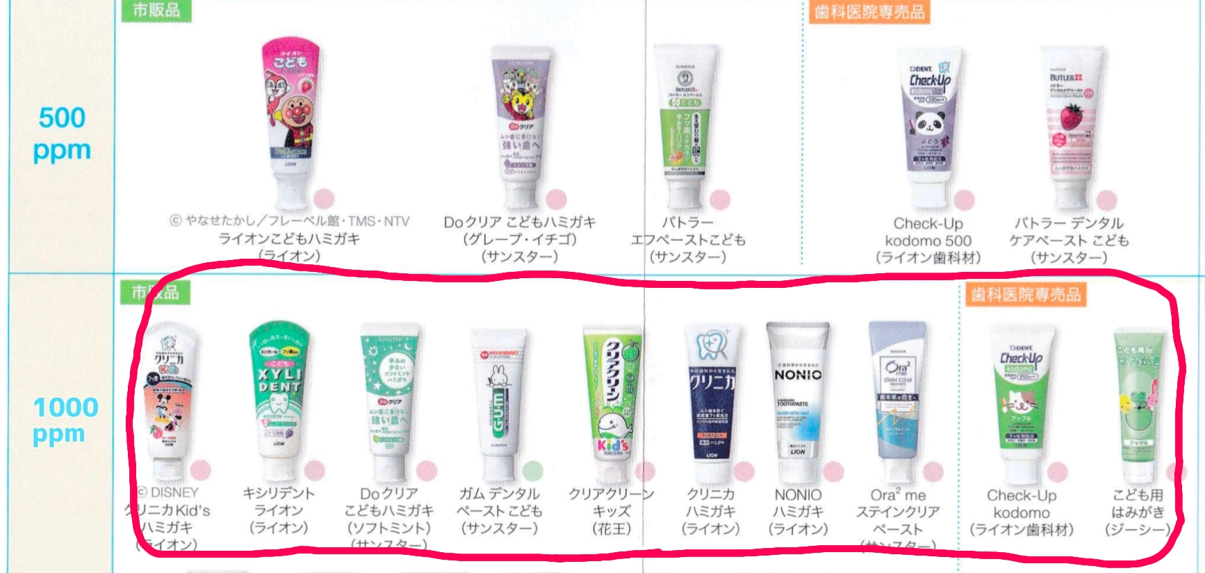 市販されているものや、歯科医院でのみ販売されている歯磨き粉で1000ppmのものが歯の生え始めから使用できるようになりました。