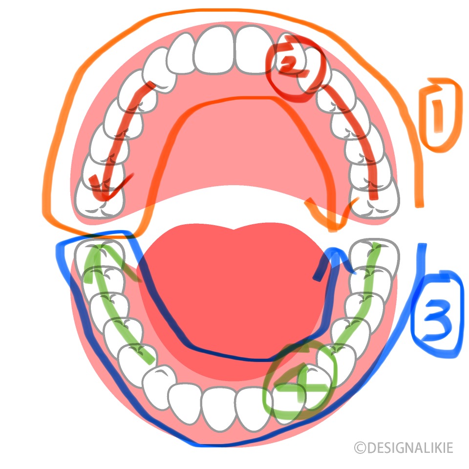 図のように、どこからスタートでも構いません。噛む面が最後になっても構いません。が、一筆書きのように進んでいくと良いでしょう。